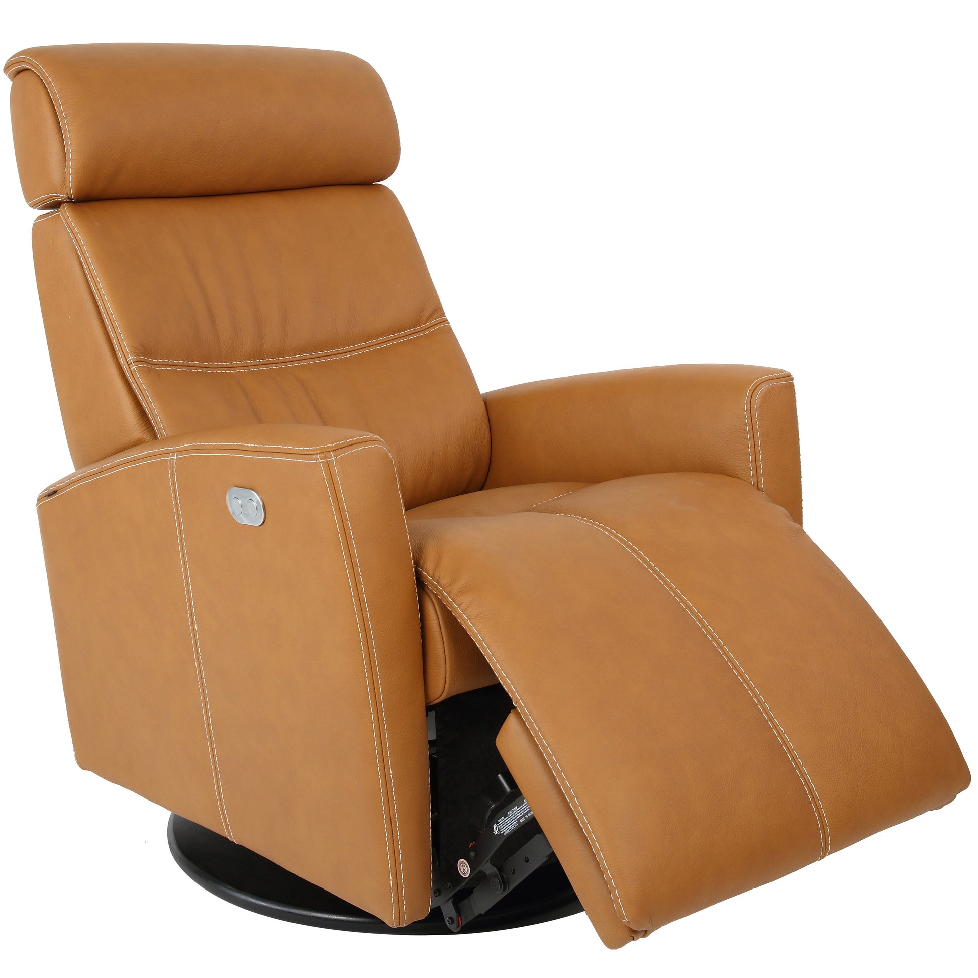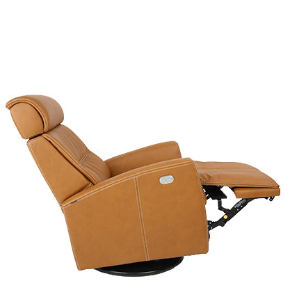 Fjords Milan swing relaxer, featuring an adjustable height and angle headrest, makes the seating experience ergonomic and gives your lower back correct support. Available in all our leathers and select fabrics, Milan is a swivel/glider/rocker recliner available in motorized and manual versions. The design is available in two sizes, small and large. Black base is standard on Milan.