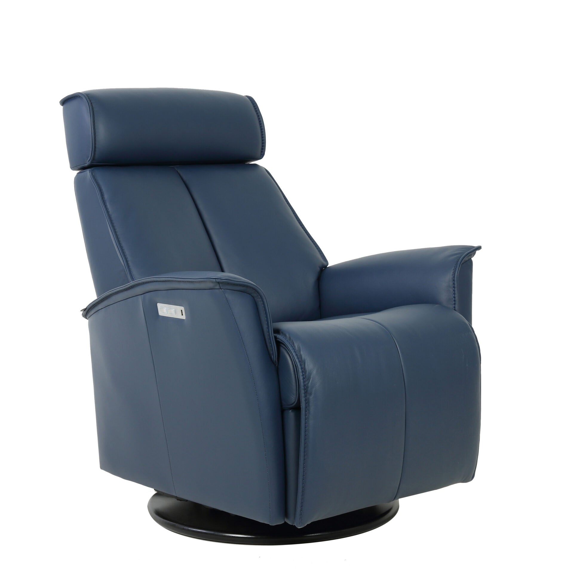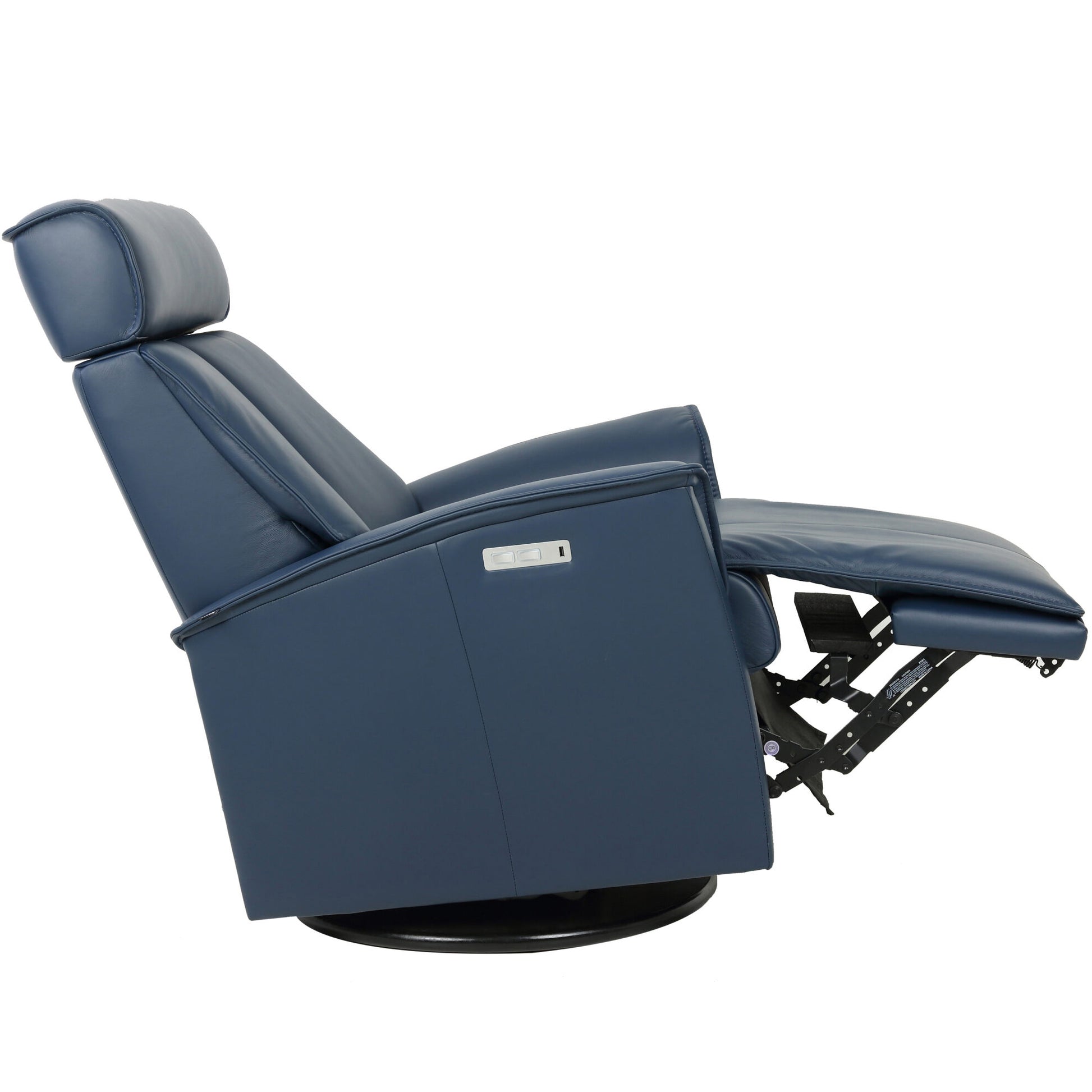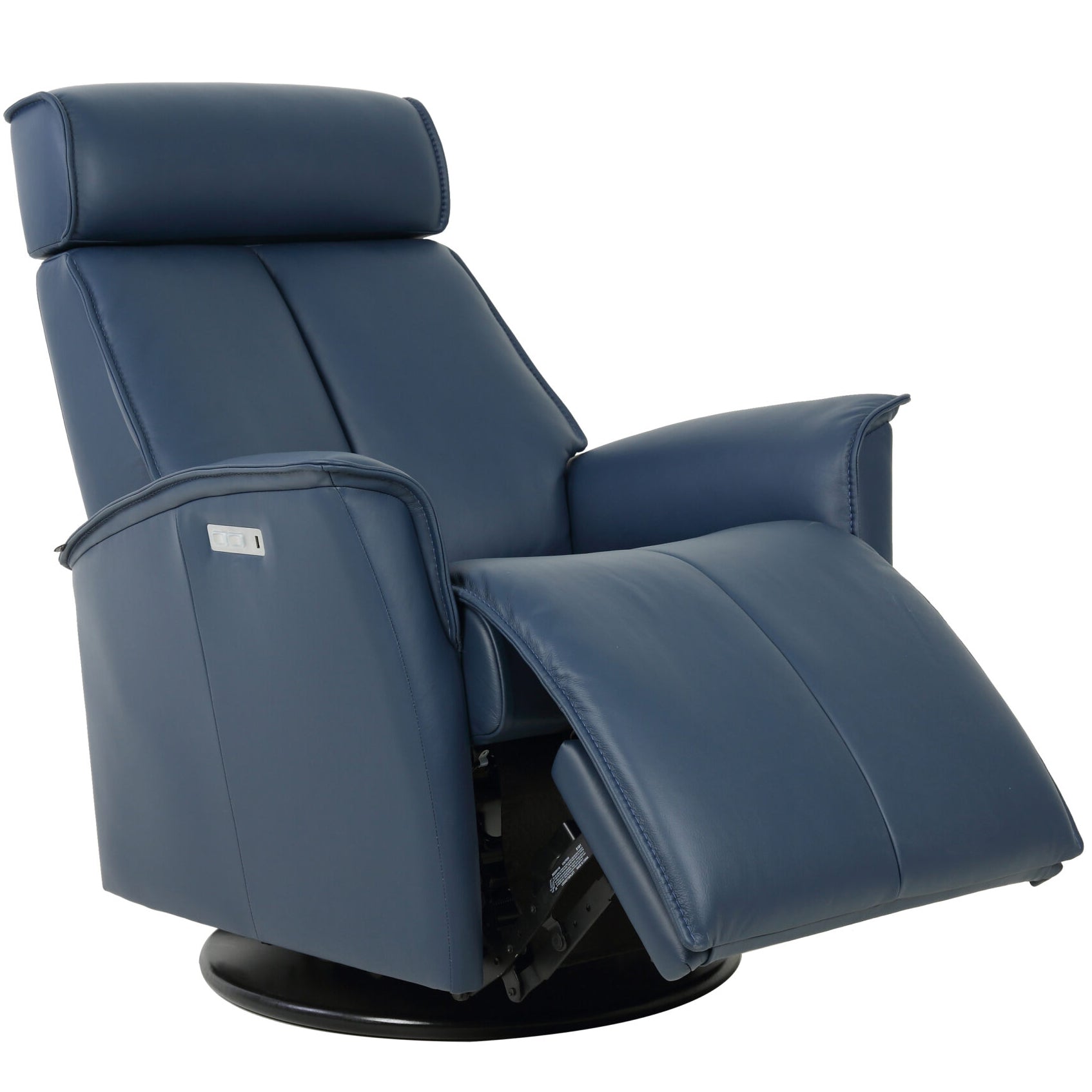 The Fjords Venice swing relaxer with a height adjustable headrest and manual release headrest angle, makes the seating experience ergonomic and gives your lower back correct support. Available in all our leathers and select fabrics, the Venice is a swivel/glider/rocker recliner available in motorized and manual versions. Black Base is standard on Venice.
